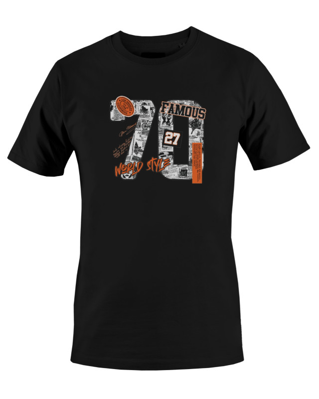 Upgrade your casual wardrobe with this trendy “70” graphic T-shirt featuring a bold newspaper-style print with stylish orange accents. The modern street-style design makes it perfect for everyday wear and fashion-forward looks.